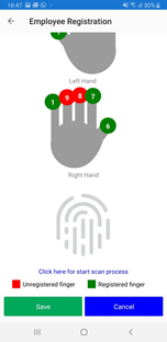 - Admin and employee can register multiple fingers using this app, and the registered fingers will be displayed in GREEN color while un registered will be displayed in RED color.