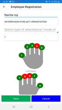 - Once finger scanned successfully, admin will click on Save button and this will save the finger data inside the app for particular employee. (Finger Registered Successfully now)