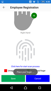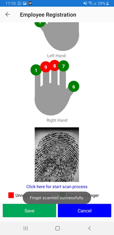 - Once employee puts his appropriate finger on Bio Metric device, app start scanning and registering that finger.