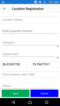 - After click on Register Location Menu item, the concern page will be displayed with the available text fields as Location Name. Parent Location, Category, Department, Fence Radius and Status etc.