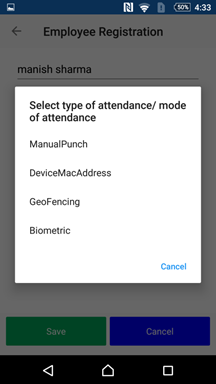 - Admin/ Supervisor needs to select the employee name from the drop down menu for whose Mobile Mac address he is going to register/ mobile belongs to which particular employee.